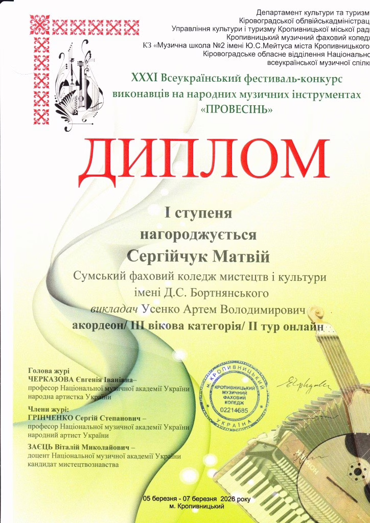 Творча родина Коледжу вітає Матвія СЕРГІЙЧУКА та його викладача Артема Усенка з зайнятим І-м місцем у XXXІ ВСЕУКРАЇНСЬКОМУ ФЕСТИВАЛІ-КОНКУРСІ ВИКОНАВЦІВ НА НАРОДНИХ МУЗИЧНИХ ІНСТРУМЕНТАХ “ПРОВЕСІНЬ” (м. Кропивницький, 05-07 березня 2026р.)!!!