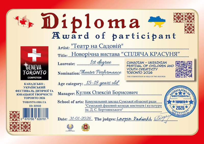 Творча родина СФКМІК щиро вітає талановите студентське об’єднання «Театр на Садовій» із блискучим тріумфом – І місцем у КАНАДСЬКО-УКРАЇНСЬКОМУ ФЕСТИВАЛІ ДИТЯЧОЇ ТА ЮНАЦЬКОЇ ТВОРЧОСТІ «ТОРОНТО 2026» (31.01.2026р.). Високу оцінку міжнародного журі отримала вистава «Спляча красуня» у постановці – Олексія КУЛИКА.
